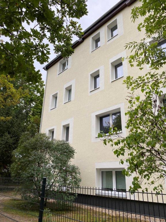 Als erste energetische Maßnahme seit der Übertragung des Bestandes hat der Eigenbetrieb Wohnungswirtschaft die Fassade im Objekt Friedrich-Engels-Str. 34 in Hohen Neuendorf sanieren lassen. In der Zeit von März 2025 bis August 2025 wurden die Fenster erneuert und die Fassade gedämmt. In diesem Zusammenhang musste der Dachüberstand erweitert, der Sockelputz sowie die Überdachung des Eingangsbereiches erneuert und die vorhandenen SAT-Anlagen neu verortet werden.