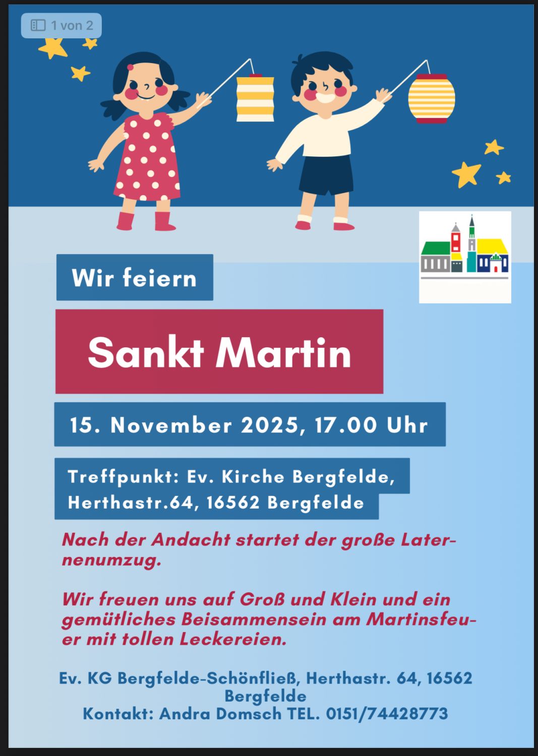Herzlich eingeladen sind alle Kinder und Familien zu unserer diesjährigen Martinsandacht in der Kirche Bergfelde. Nehmen Sie sich ca. 30 Min. Zeit, um mit Musik und der Martinsgeschichte das Martinsfest zu beginnen. Danach gibt es einen großen Laternen- und Fackelumzug mit der Feuerwehr von der Kirche zur Feuerwehr. Auf dem Gelände der Feuerwehr gibt es dann viele kulinarische Angebot uvm. Alle Vereine, die Grundschule und die Kitas von Bergfelde sind daran beteiligt.