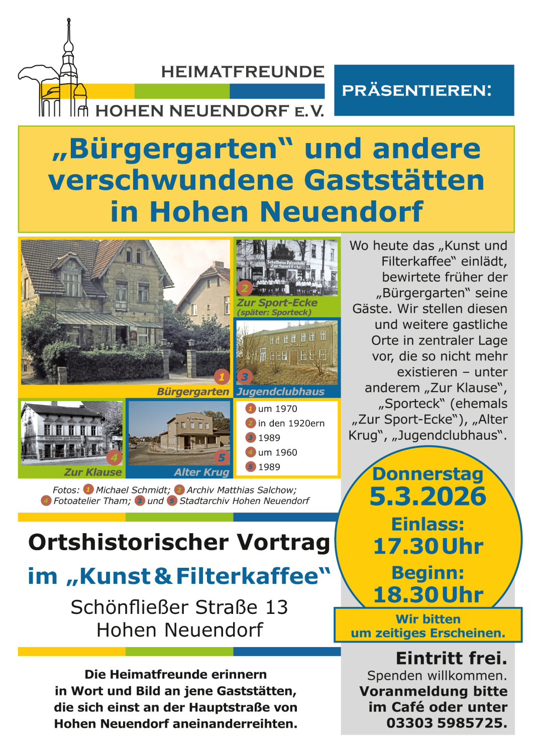 Die Heimatfreunde Hohen Neuendorf laden am Donnerstag, 5. März, zu einem ortshistorischen Vortrag in das Café „Kunst & Filterkaffee“, Schönfließer Straße 13 in Hohen Neuendorf. Einlass 17.30 Uhr, Beginn 18.30 Uhr. Wir bitten um zeitiges Erscheinen!