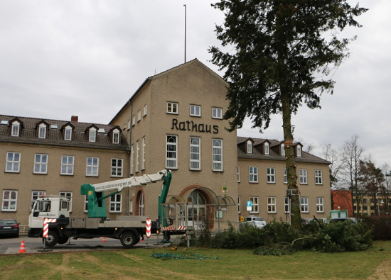 Im Zuge der bauvorbereitenden Maßnahmen für den geplanten Rathausanbau mit Bürgerzentrum, die im März beginnen sollen, wurde u.a. die Douglasfichte vor dem Rathaus gefällt.
